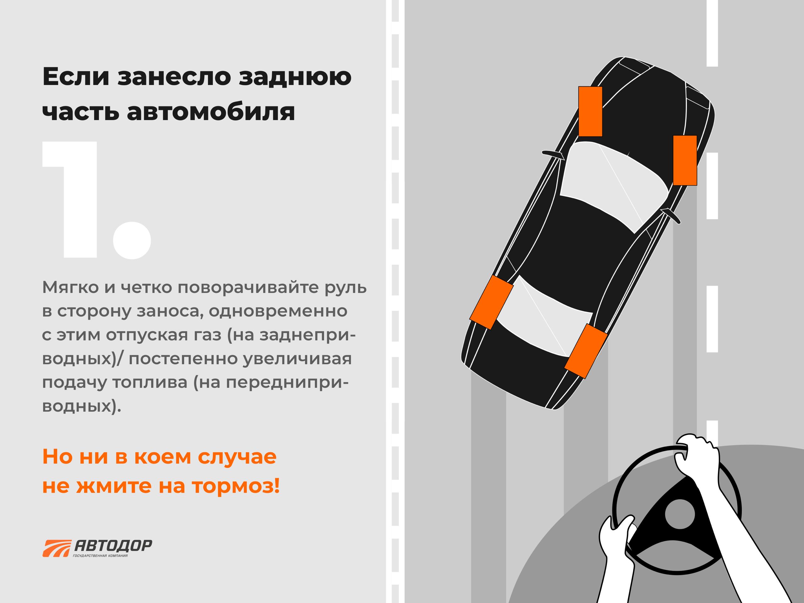 В карточках показали базовый алгоритм выхода из заноса — четко, по шагам и с визуальными подсказками.