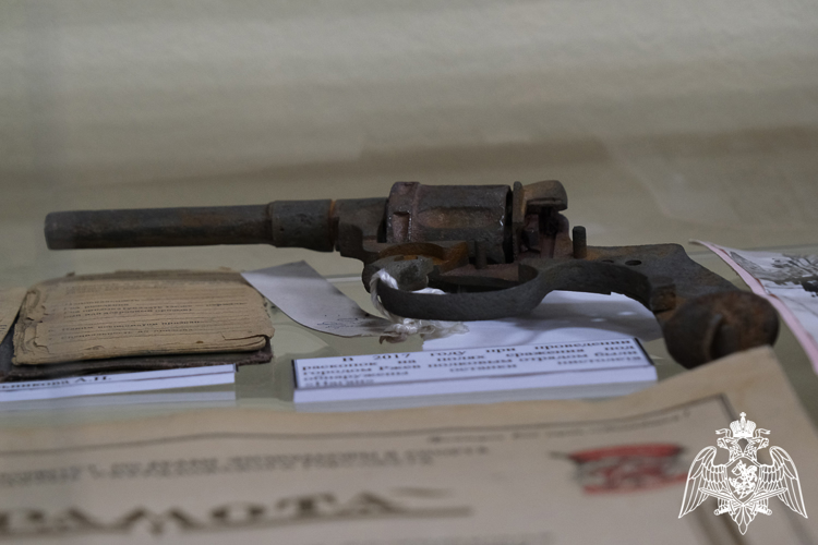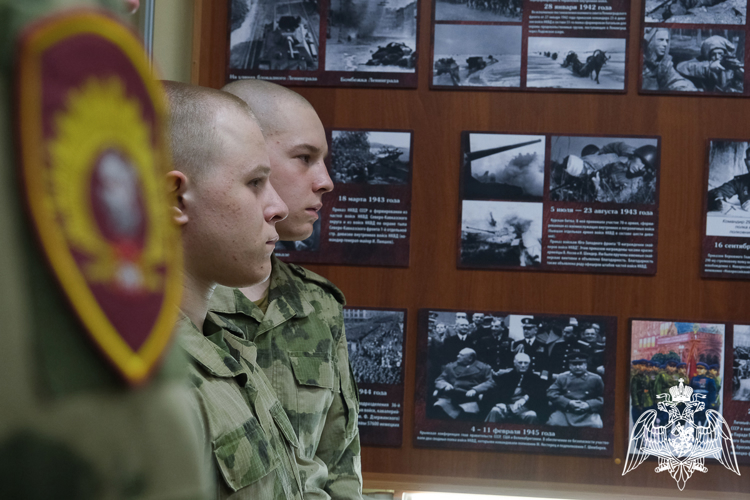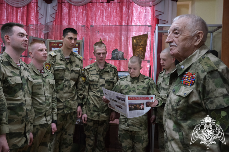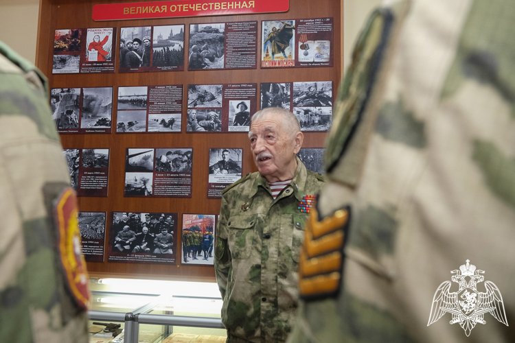 В одном из залов музея объединения помощник командующего Уральским округом по работе с ветеранами генерал-майор в отставке Владимир Гордеев познакомил курсантов факультета артиллерийского вооружения Пермского военного института Росгвардии, проходящих войсковую практику на Урале, а также военнослужащих по призыву отдельного батальона охраны и обеспечения округа, с героем первого выпуска – ветераном войск НКВД Михаилом Ефстафьевичем Белозеровым.