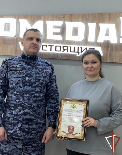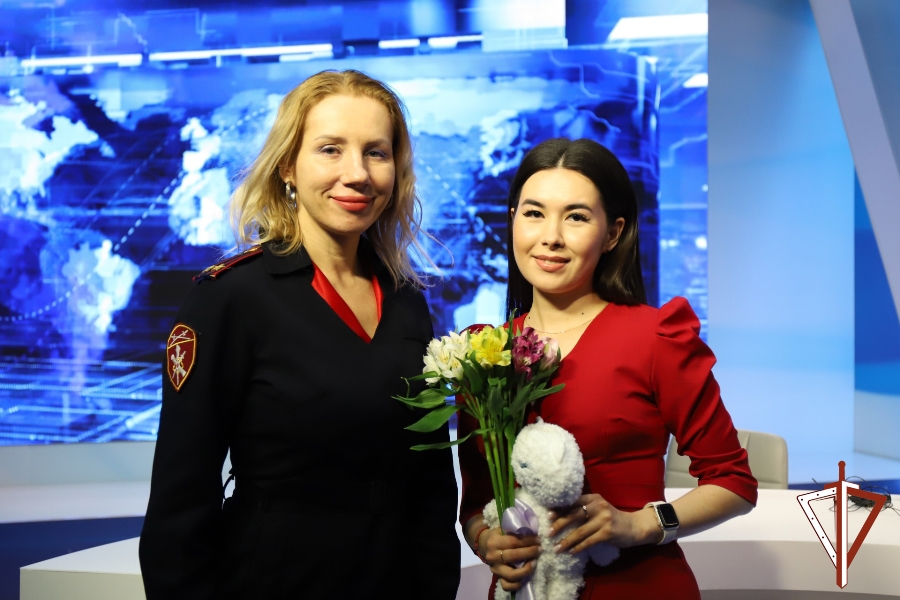 В Ханты-Мансийске начальник пресс-службы теруправления подполковник полиции Наталья Васильченко передала слова признательности за сотрудничество от имени начальника ведомства полковника полиции Евгения Симакова ведущей авторской программы «Росгвардия. Всегда на страже» Государственной телевизионной и радиовещательной компании «Югория» Любови Меровой.