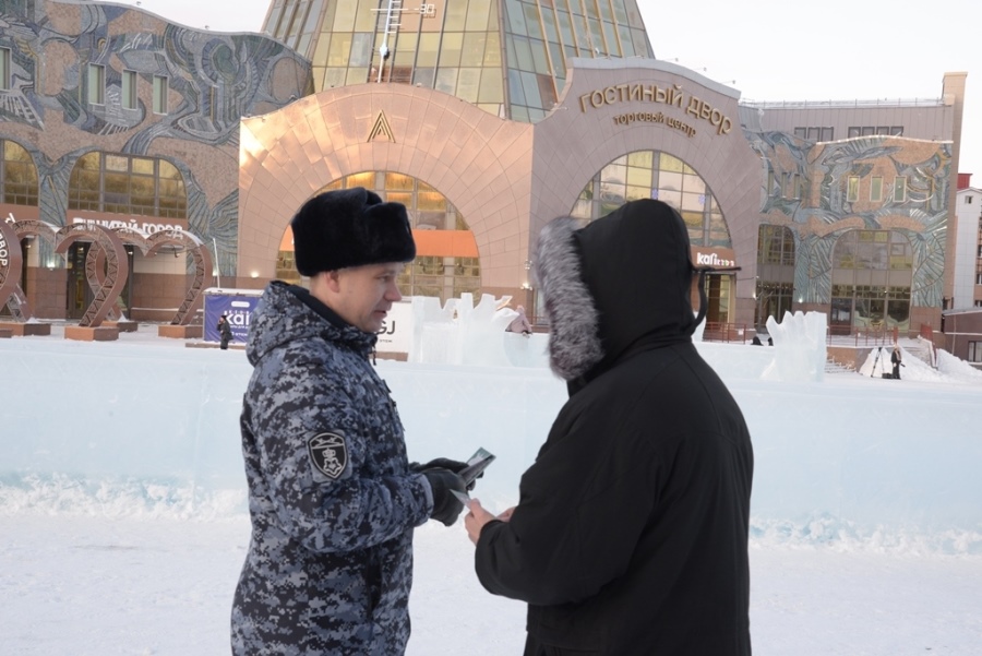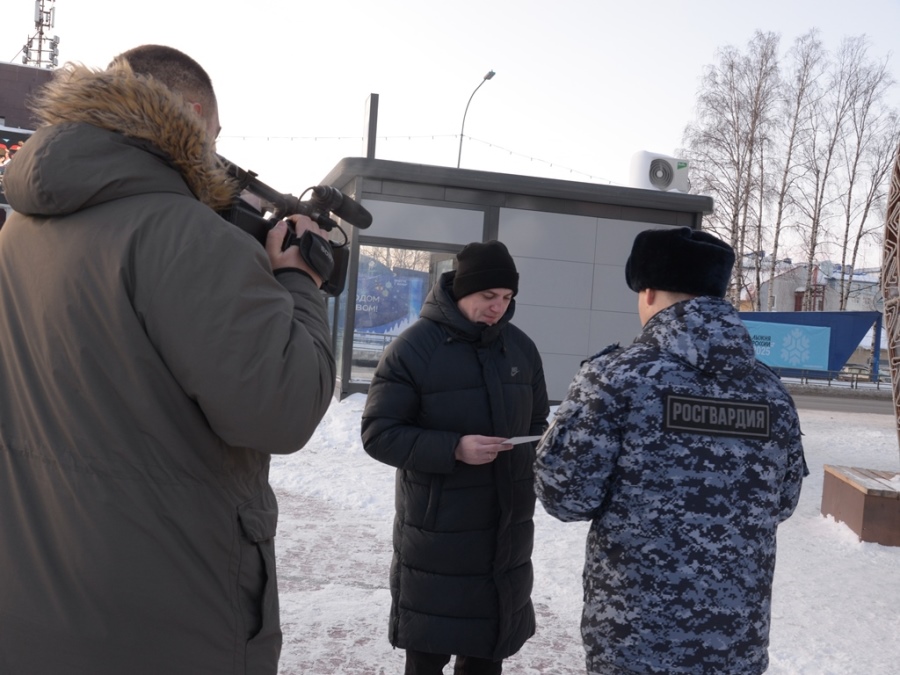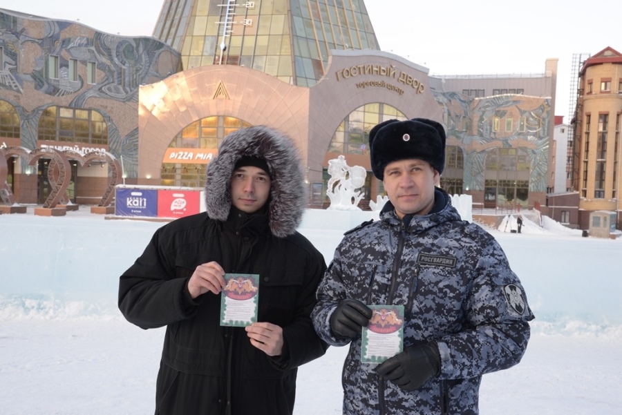 На центральной площади города сотрудники Росгвардии раздавали прохожим тематические листовки и предупреждали о безопасности в новогодние дни.